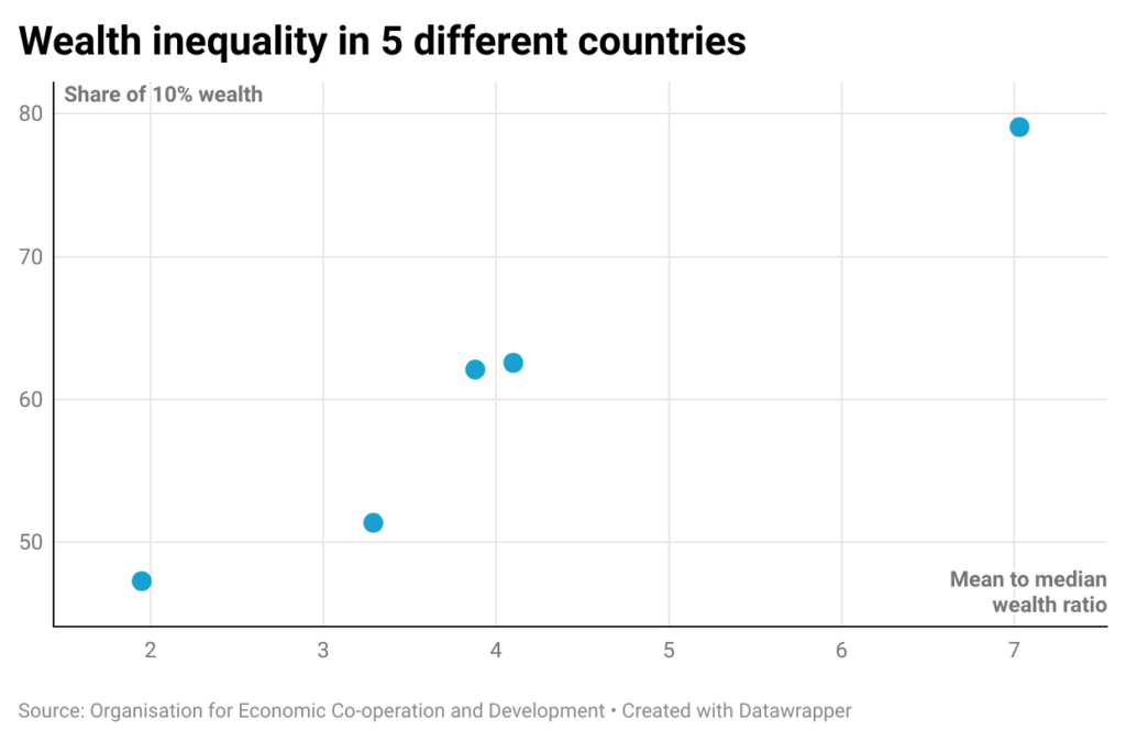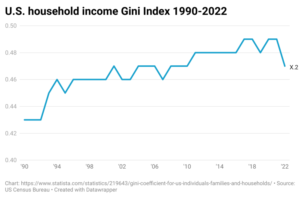 In 2022, according to the Gini coefficient, household income distribution in the United States was 0.47. This figure was at 0.43 in 1990, which indicates an increase in income inequality in the U.S. over the past 30 years.