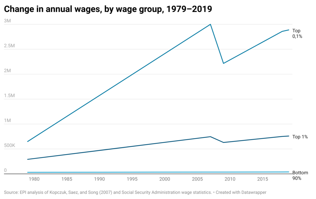 These disparities in long-term wage growth reflect a major redistribution upward of wages since 1979, as noted earlier. The bottom 90% earned 69.8% of all earnings in 1979 but only 60.9% in 2019. In contrast, the top 1.0% nearly doubled its share of earnings from 7.3% in 1979 to 13.2% in 2019. The growth of wages for the top 0.1% is the major dynamic driving the top 1.0% earnings as the top 0.1% more than tripled its earnings share, from 1.6% in 1979 to 5.0% in 2019.