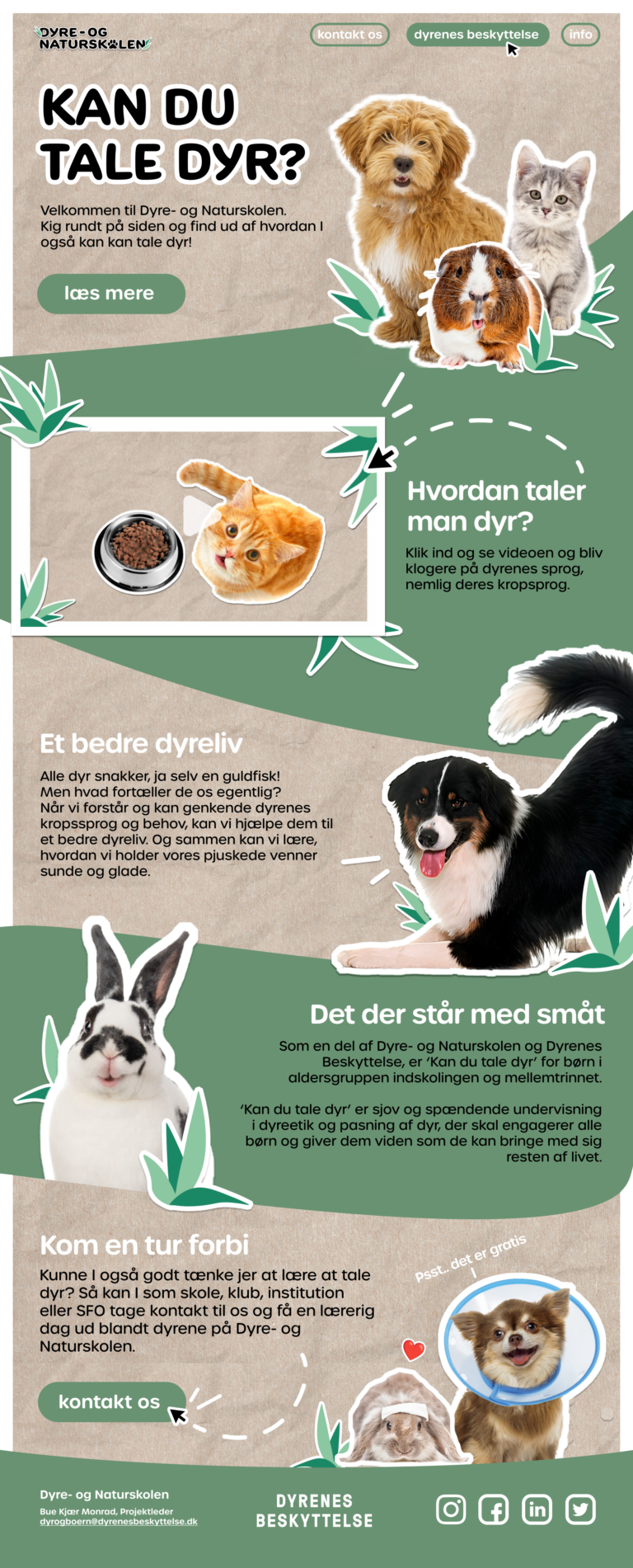 The Animal and Nature School is an initiative by Dyrenes Beskyttelse (Danish Animal Protection) aimed at educating children in animal language and animal ethics through interactive and inclusive learning experiences. My task was to develop a graphic universe and a campaign site, as well as a motion graphic, appealing to children aged 3-12 years. I created a playful and engaging concept featuring authentic images of animals and humans along with simple illustrations.
